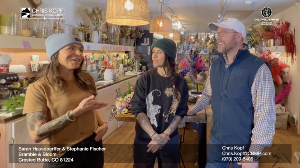 Chris Kopf: “Hey, it’s Chris Kopf, and we’re in downtown Crested Butte. We’re at Bramble and Bloom. I’m here with Sarah Hausdoerffer and Stephanie Fischer. And we’re talking about flowers today, Sarah and Stephanie. Tell me about Bramble and Bloom. How’d you get started in this business?”