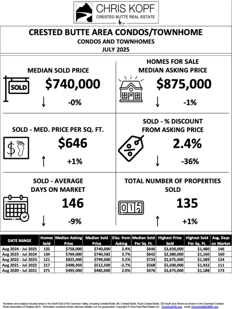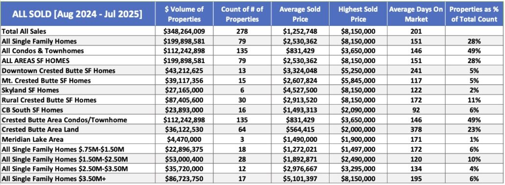 Crested Butte Real Estate Market August 2025, Showing Prior 12 Months Results – Through July 2025