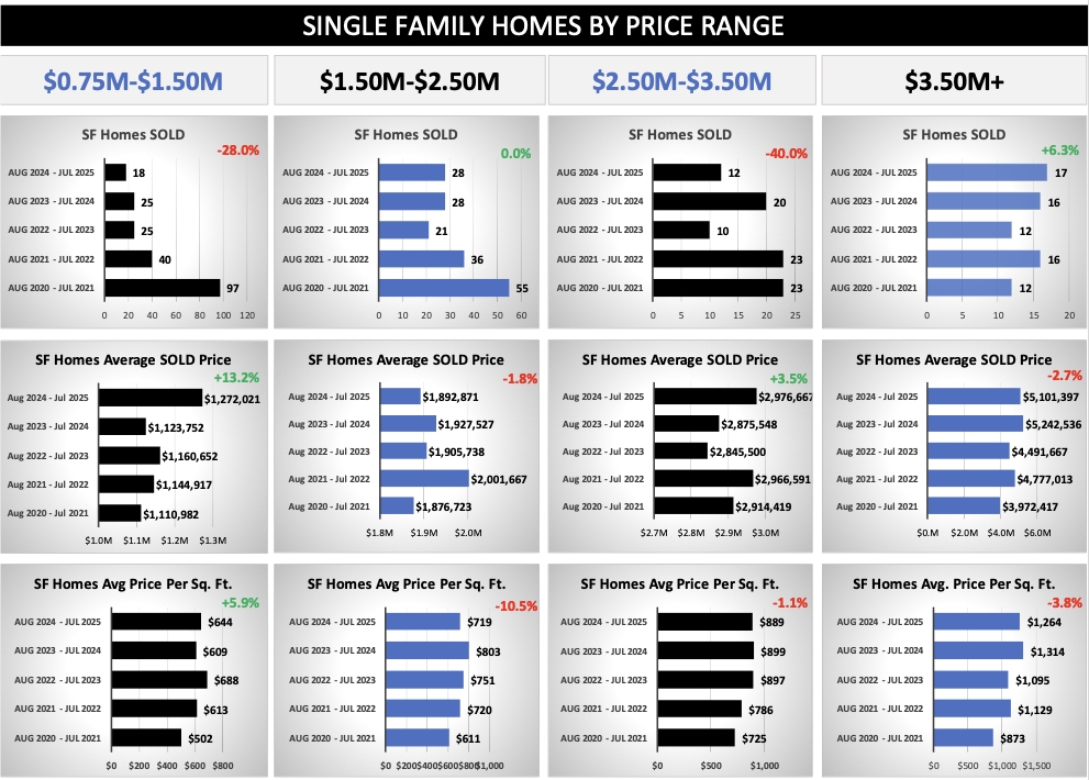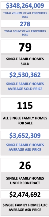 Prior 12 Month Results show transactions are flat year over year (278 vs. 282) and Volume flat ($348M vs $361M). Average days on Market currently 202 vs. 201 a year ago. Median Price of all Single Family Home Sold Prior 12 Months is similar at $2,000,000 vs $2,025,000 this time last year, Median Price per sq. ft. for all Single Family Homes Sold also similar at $749 vs. $736 last year.