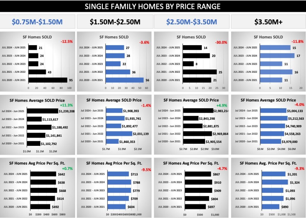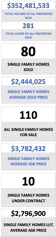 Prior 12 Month Results show transactions up slightly at 2.8% year over year (281 vs. 280) and Volume flat ($352M vs $360M). Average days on Market currently 202 vs. 195 from a year ago. Median Price of all Single Family Home Sold Prior 12 Months is similar at $1,965,000 vs $2,030,000 this time last year, Median Price per sq. ft. also similar at $745 vs. $752 this time last year.