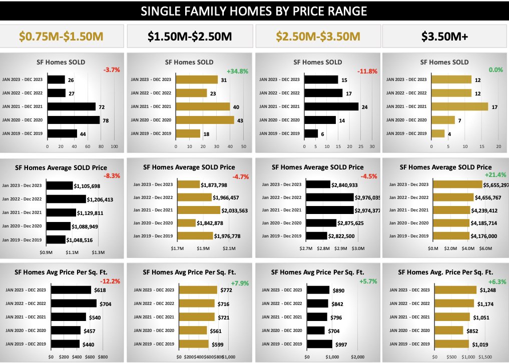 2023 transactions down 26% year over year (260 vs. 353) and Volume down 17% ($327M vs. $394M. Average Days on Market currently 196 vs. 178 from a year ago. All Single Family Homes above $1.5M Price per Sq. Ft. show increase Year over Year.