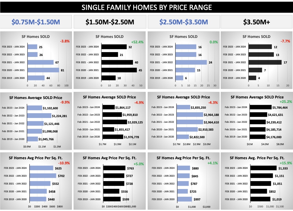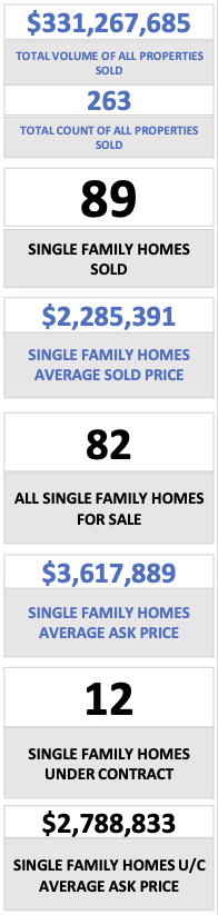 and total volume of all properties sold for all areas was $331,267,685. - All Single Family Homes – The Median Sold Price for single family homes was $1,775,000.