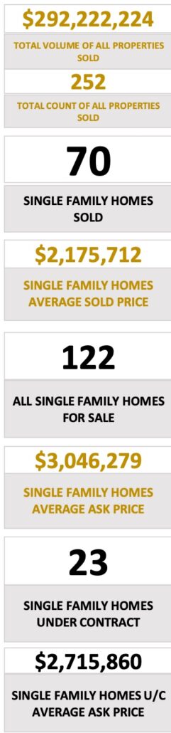 - All Areas – 252 total properties sold, 70 single family homes, total volume of all properties sold for all areas was $292,222,224.