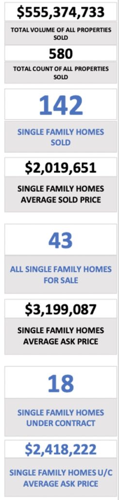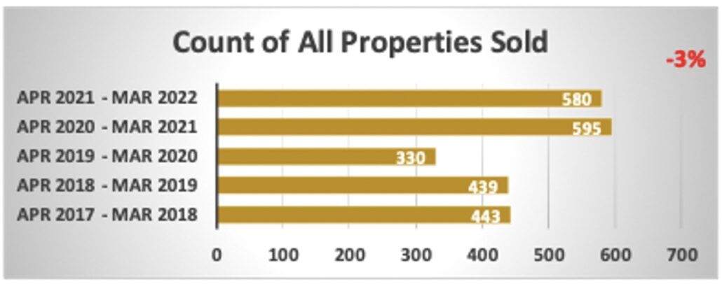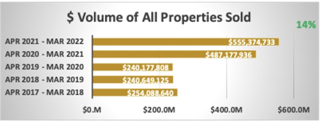 Year over year Volume is up only 14% (last month it was up 46%) finishing at $555M vs $487M in 2020. Total Transactions are down 3% at 580 Properties Sold vs 595 for the same 12-month period one year ago.