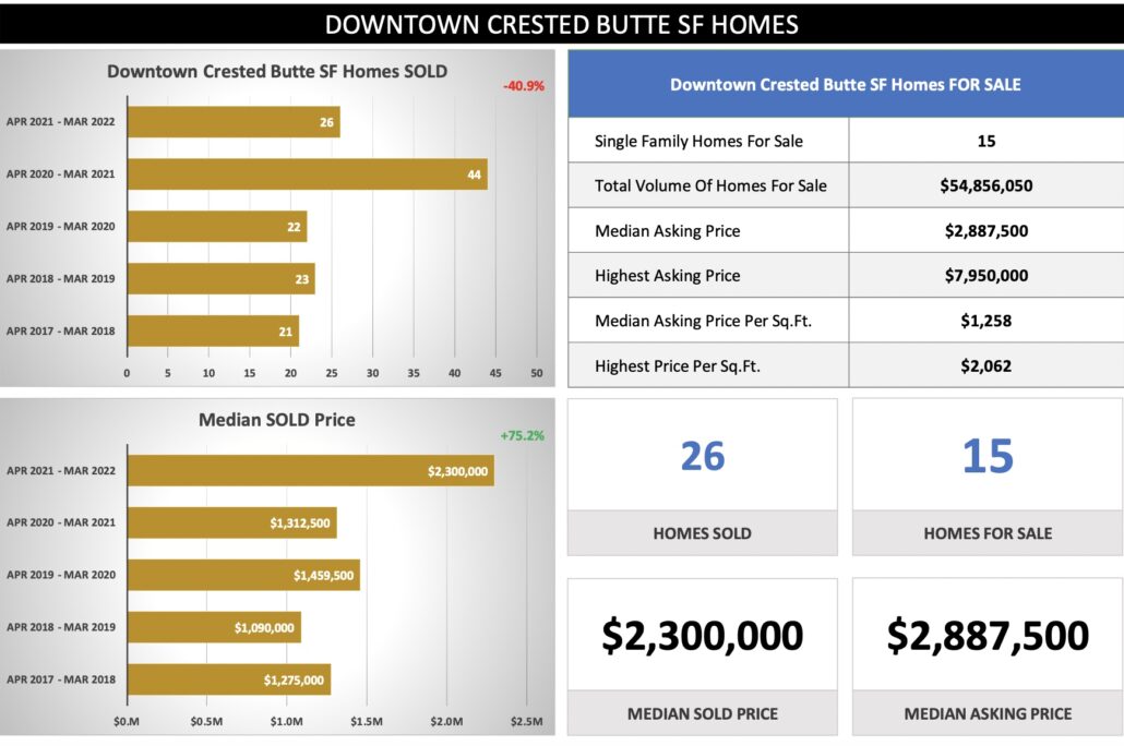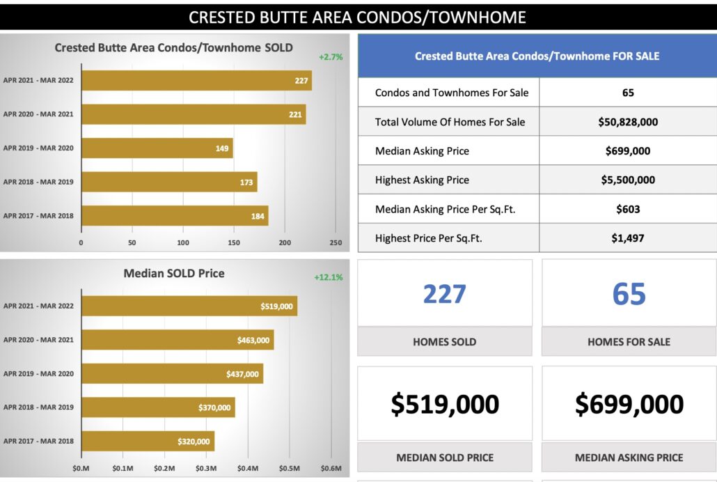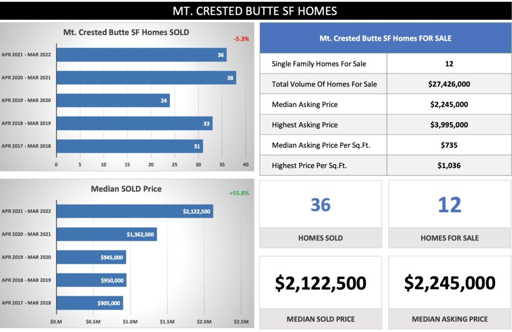 Crested Butte Real Estate Market Report March 2022 + Outlook – Buyer Demand is still strong, inventory levels lower, and supply demand forces in play – real estate price points still rising. With mortgage rates are now above 5% this could slow price ascension, but I believe Seller’s Market will remain through Summer/Fall.
