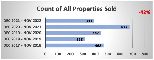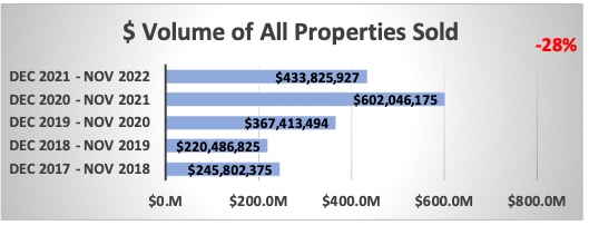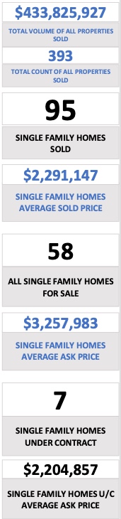 - There were a total of 393 total properties sold, 95 of those being single family homes sold, and total volume of all properties sold for all areas was $433,825,927.