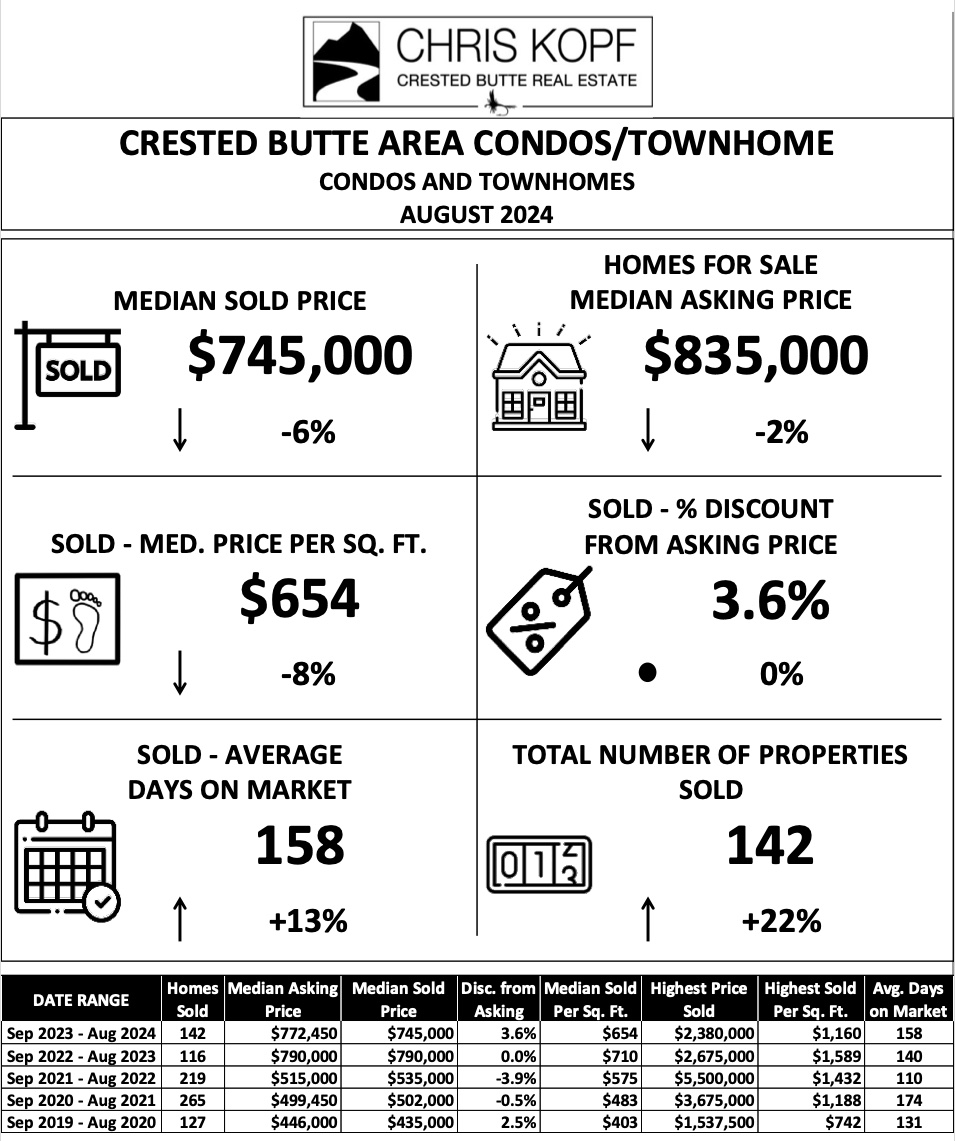 There have been 142 Condos & Townhomes Sold in the past 12 months in the Crested Butte area.