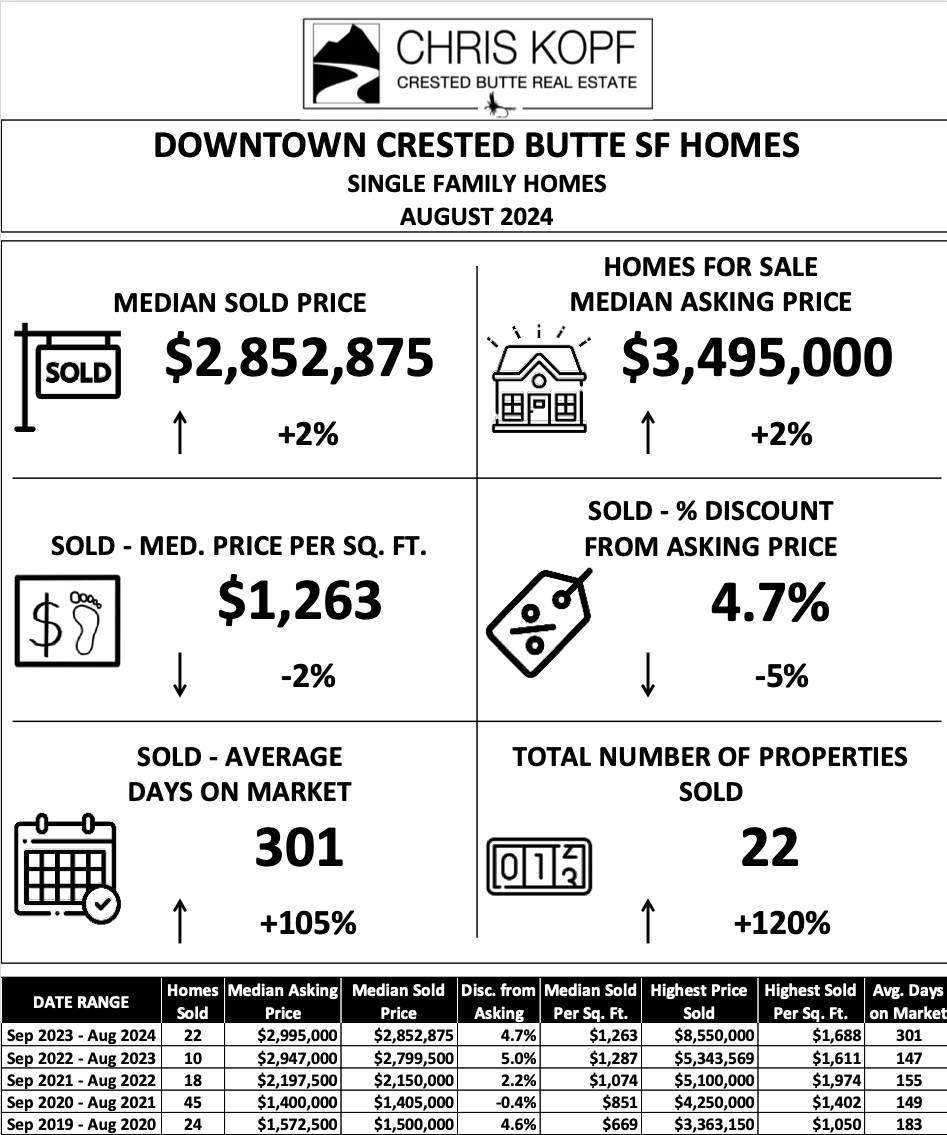 - Downtown Crested Butte Single Family Homes Sold – 22 Homes Sold prior 12 months, Median Sold Price of $2,852,000. The Median Sold price per sq. ft. was $1,263, Average Discount from Asking to Selling Price was 4.7%