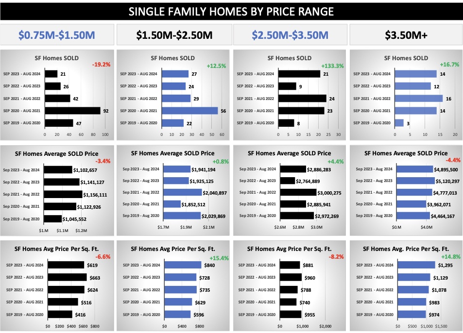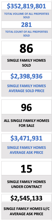 - All Single Family Homes – The Median Sold Price for single family homes was $2,059,000.