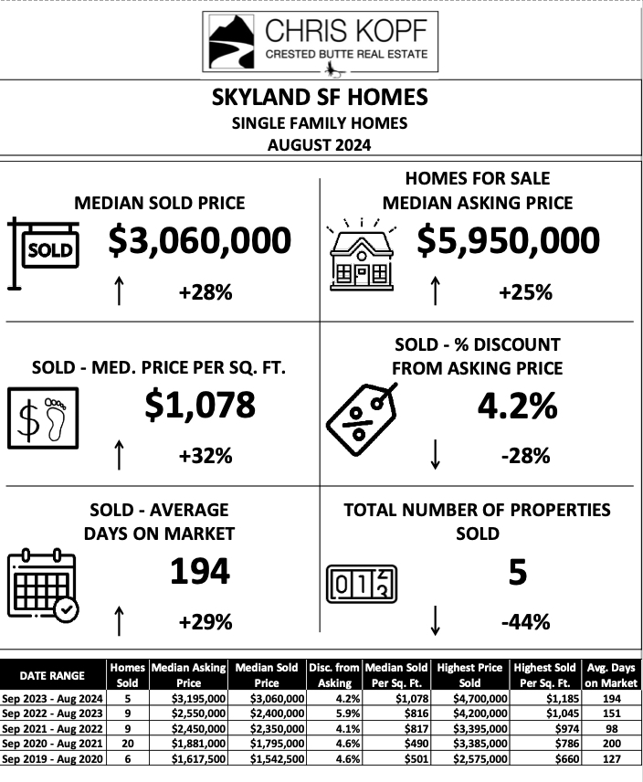 There have been 5 Single Family Homes Sold in the Skyland area in the past 12 months – see more info and the Results for All other Areas in the Full Crested Butte Market Report.
