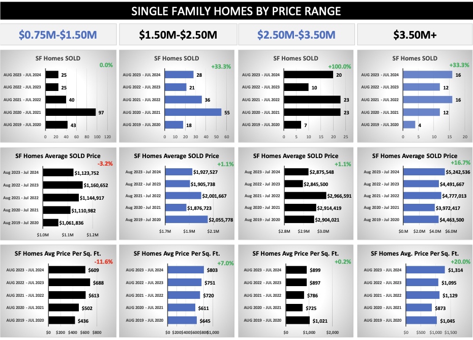 • All Single Family Homes – The Median Sold Price for single family homes was $2,025,000.