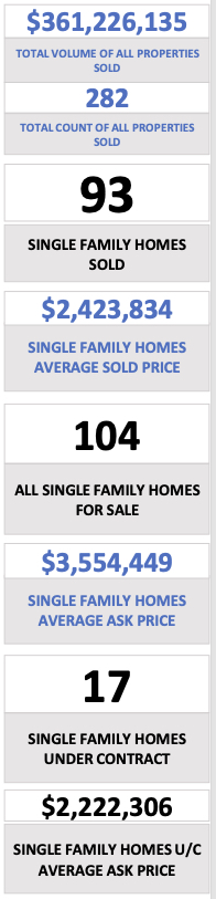 • All Areas All Property Types – There were 282 total properties sold, 93 of those being single family homes sold, 133 Condos & Townhomes and 56 parcels of Land. Total volume of all properties sold for all areas was $361,226,135.