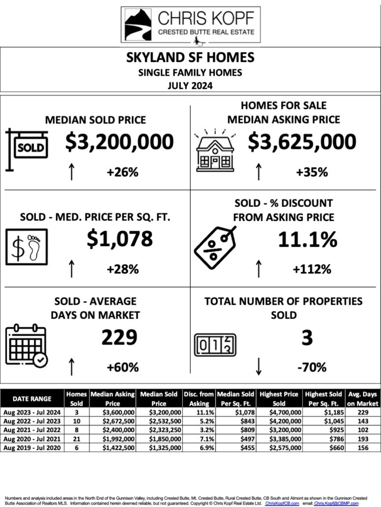 There have been 3 Single Family Homes Sold in the Skyland area in the past 12 months – see more info and the Results for All other Areas in the Full Crested Butte Market Report.