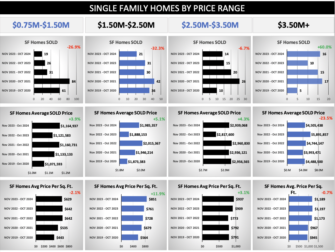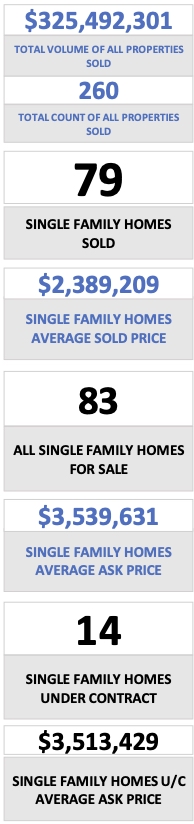 - All Single Family Homes – The Median Sold Price for single family homes was $2,114,500.