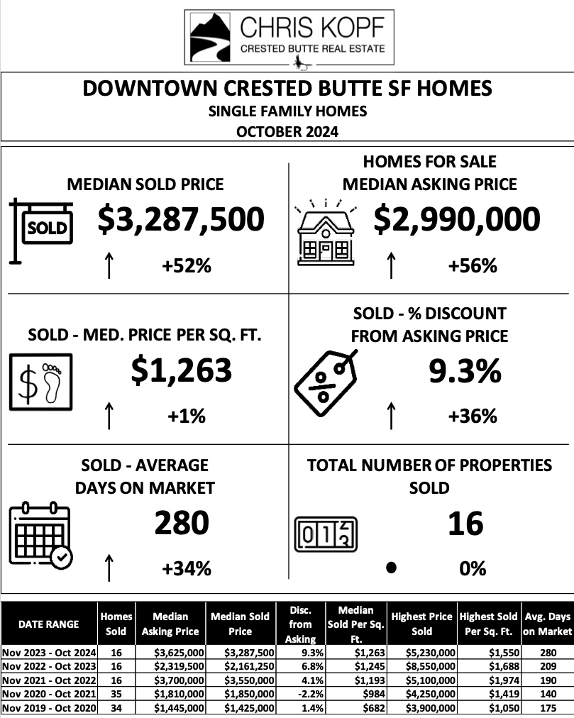 - Downtown Crested Butte Single Family Homes Sold – 16 Homes Sold prior 12 months, Median Sold Price of $3,287,500. The Median Sold price per sq. ft. was $1,263, Average Discount from Asking to Selling Price was 9.3%.
