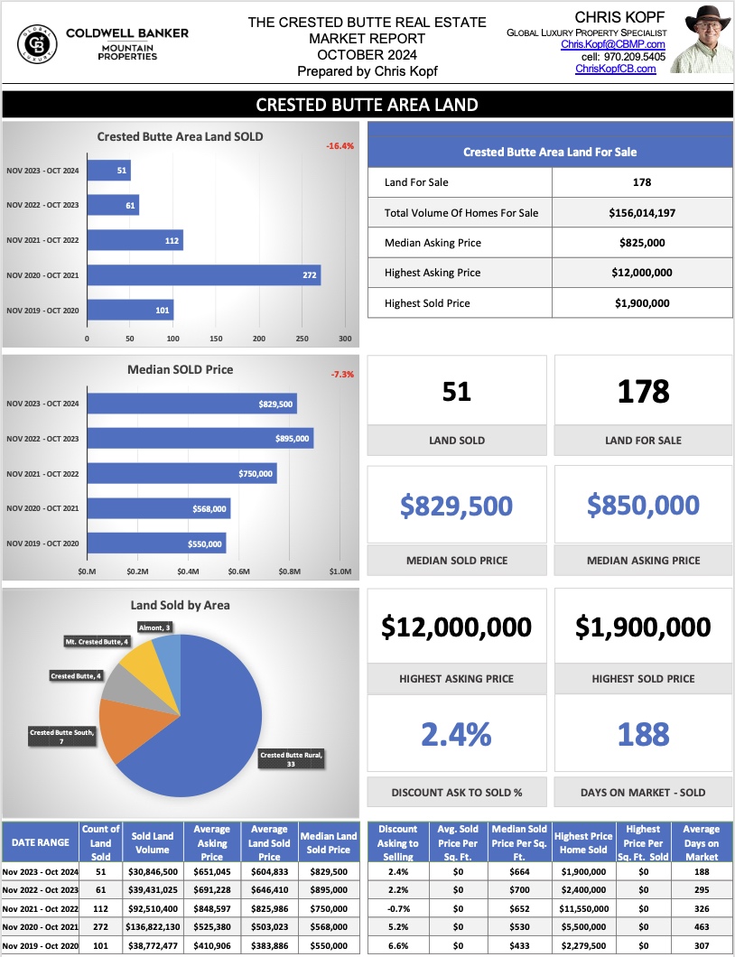 All Areas Crested Butte Land Sales – Prior 12 months – see additional detail and more info and the Results for All other Areas in the Full Crested Butte Market Report.