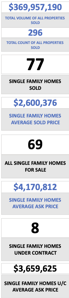Prior 12 Month Results show transactions are up year over year (296 vs. 288) and Volume flat ($369M vs $372M). Average days on Market currently 280 vs. 165 a year ago. Median Price of all Single Family Home Sold Prior 12 Months is up at $2,100,000 vs $2,064,500 this time last year, Median Price per sq. ft. for all Single Family Homes Sold was flat at $801 vs. $798 last year.