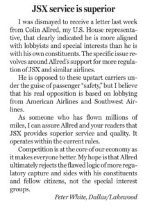 Hiding behind baseless allegations and fearful of competition and innovation, these companies are trying to outlaw small air carriers, like JSX, that care about providing you with much needed choice and high-quality service. It’s hardly a surprise that these airlines would try to mislead you about JSX. American has an 86% market share at DFW and Southwest has a stunning 96% market share at Love Field. This is a de facto duopoly in Dallas that they surely want to preserve. That they’d stoop to trying to convince regulators and lawmakers that safety is in jeopardy, in order to maintain their duopoly, is shameful.