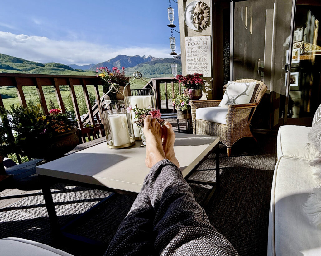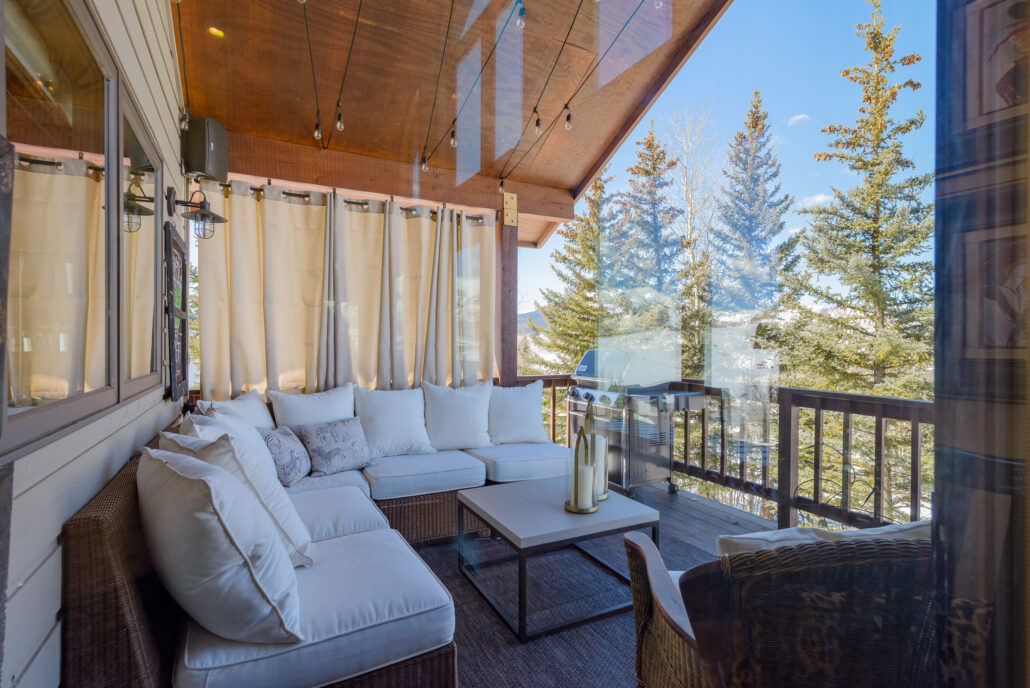 The back deck has become a favorite gathering space, featuring outdoor speakers, infrared heaters, and an exterior hot tub. Whether enjoying après-ski evenings, summer dinners, or simply relaxing after a day in the mountains, the space offers a comfortable setting to take in the surrounding views and enhances the home’s connection to its natural mountain setting.