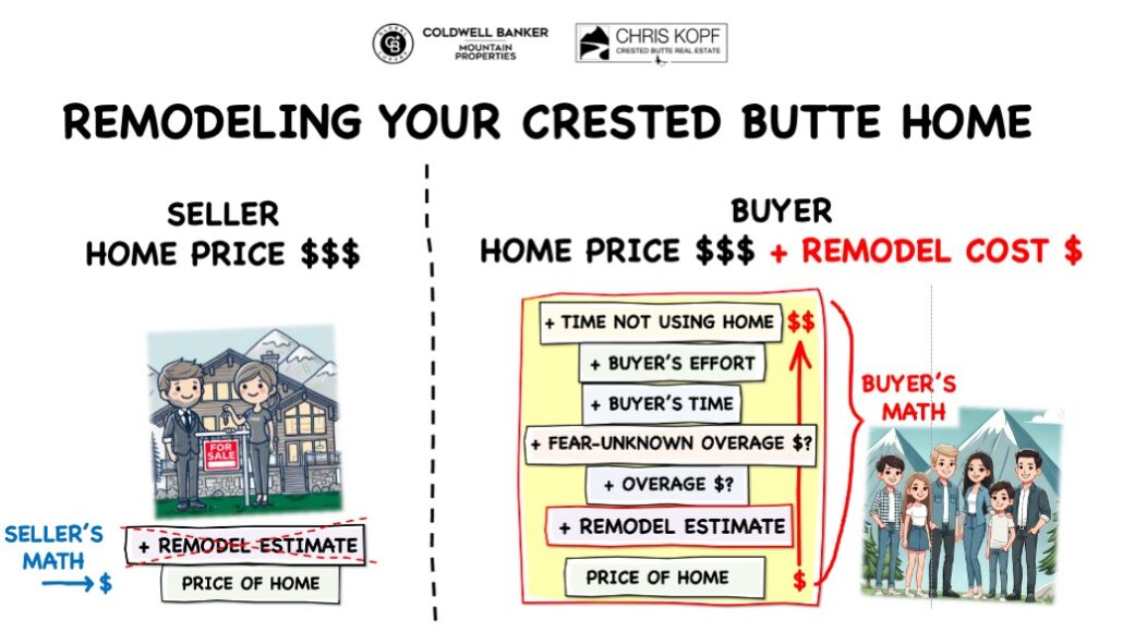 When a Buyer knows that there is money needed to be spent on a remodel they are fearful. They will factor in the known cost for the remodel, AND the unknown costs… And this cost is likely to be more than double the estimated cost. Plus they will add their time and effort to take on the project. Additionally a buyer is typically new to Crested Butte and may take time to feel comfortable to put the their team together.