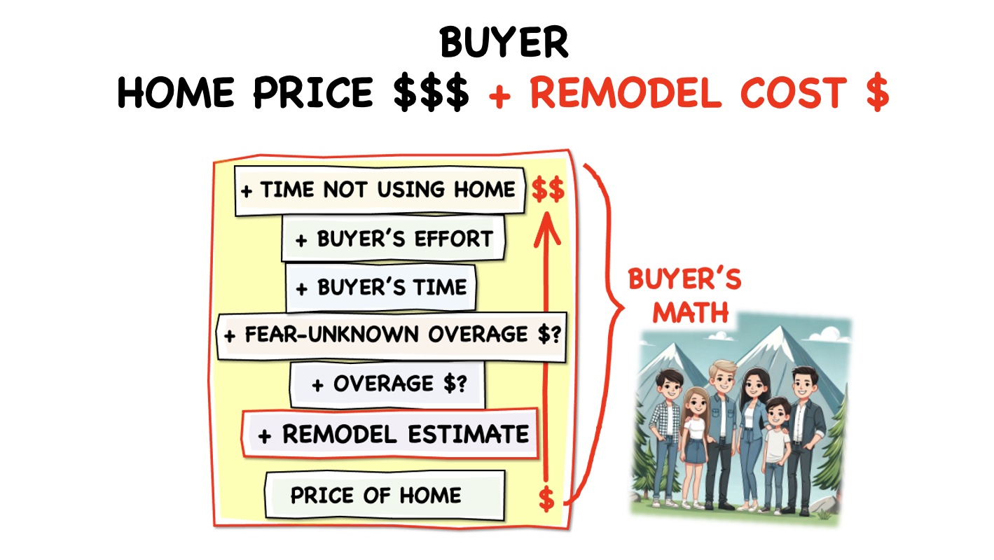 The cost of the home + the remodel cost + the overage fudge factor + the Fear and additional risk it will be more + their Buyer’s time and effort to oversee the project + the carrying cost for the time the Buyer will own the home but can’t yet enjoy it (because it is filled with workers and under construction)…