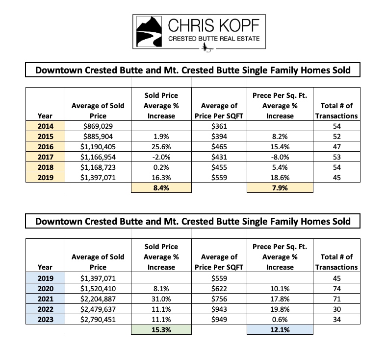 The Crested Butte real estate market did not really stabilize until 2014. From 2014 until Covid the Crested Butte real estate market saw a steady price appreciation of approximately 8% year over year. During the Covid pandemic we saw another spike in real estate transactions and values. In 2022 and 2023 we have seen average price per sq. ft. level out.