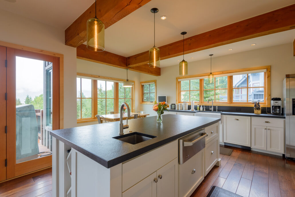 Timber Frame Construction: Vaulted ceilings and massive beams create a grand, rustic atmosphere in the Great Room.